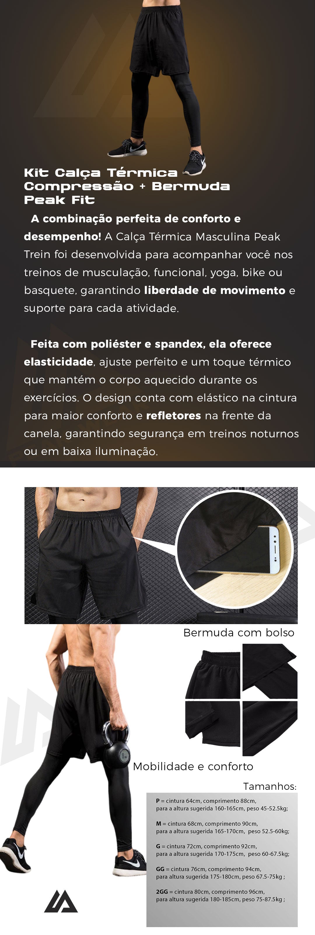 O combo perfeito para treinos com conforto e desempenho! O Kit Calça Térmica Compressão + Bermuda Peak Fit combina uma calça de compressão estilo segunda pele com uma bermuda integrada, proporcionando suporte muscular, liberdade de movimento e estilo em uma única peça.